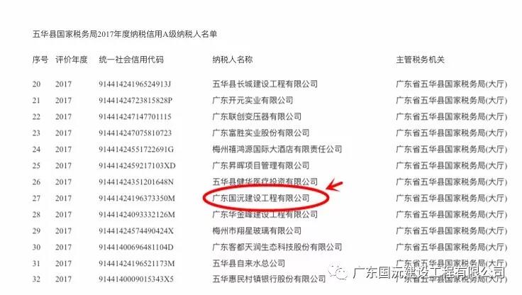 近日,五华县发布2017年度A级纳税人名单,此次共有69户纳税人被评为2017年度A级纳税人,继2016年度后国沅建设再被评为A级纳税人。