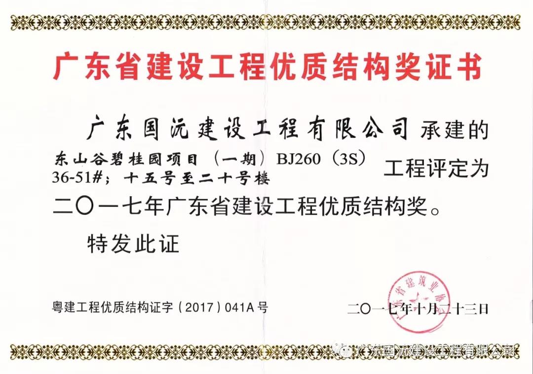 近日,由广东国沅建设工程有限公司(以下简称国沅建设)承建的【东山谷碧桂园项目(一期)BJ260(3S)工程】荣获广东省建筑业协会颁发的广东省建设工程优质结构奖,为国沅建设的精品工程荣誉再添新辉。