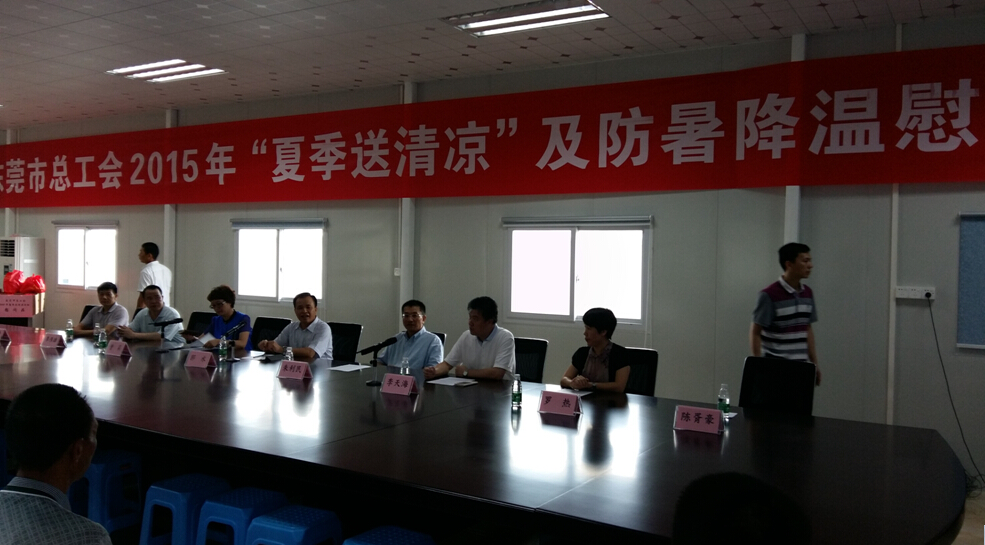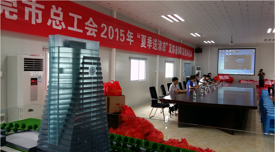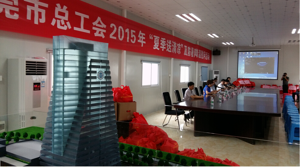 6月23日下午,东莞市2015年全市工会“夏季送清凉”及防暑降温检查工作正式拉开序幕,市人大常委会副主任、市总工会主席郭水带队走访慰问,第一站就来到了由我司承建的东莞中国科学院云计算技术创新与育成中心建设工地,为在炎炎暑日下还坚守在一线的工人们送来毛巾、防暑杯、凉茶等防暑降温用品,让他们清凉一“夏”。