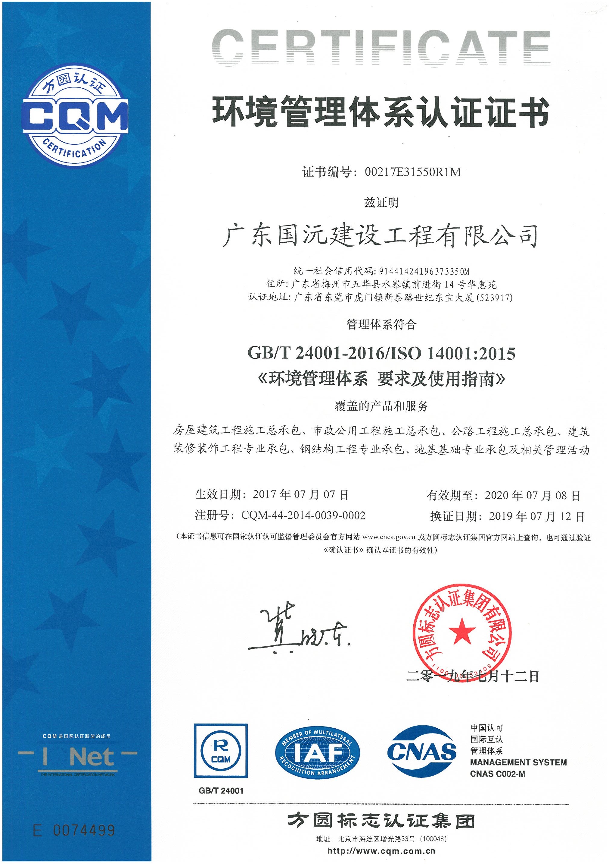 环境管理体系认证证书